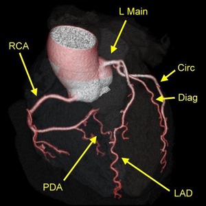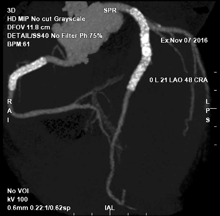 La valutazione anatomica del circolo coronarico, l’eventuale indicazione alla procedura di rivascolarizzazione ed il follow-up dei pazienti rivascolarizzati sia mediante stenting che mediante By-Pass sono sempre stati prerogativa della coronarografia invasiva. Negli ultimi anni l’introduzione di apparecchi tomografici sempre più sofisticati dal punto di vista tecnologico, associati a tubi radiogeni ad alta velocità ECG-sincronizzati, hanno consentito un incremento della risoluzione spaziale e temporale tale da poter considerare questa tecnologia una valida alternativa alla coronarografia invasiva per lo studio della malattia coronarica permettendo di fatto l’esclusione di significativa malattia coronarica o la identificazione di ostruzioni coronariche con elevato dettaglio anatomico. Al contrario della coronarografia che necessita di ricovero, la TAC delle coronarie è un esame ambulatoriale di breve durata, circa 10-15 minuti, durante il quale il paziente viene sdraiato supino su un lettino, monitorato con una traccia elettrocardiografica e previa somministrazione endovena di mezzo di contrasto iodato verranno acquisite delle immagini del cuore e dell’albero coronarico. Prerequisito fondamentale è una corretta preparazione da parte del medico curante che dovrà ottimizzare la frequenza cardiaca intorno a valori di 50-55 bpm e la capacità del paziente di rimanere immobile trattenendo il fiato per circa 10 secondi. Finito l’esame il paziente tornerà subito alle sue normali occupazioni. Propedeutiche all’esame sono le analisi di routine per la somministrazione di mezzo di contrasto iodato ( azotemia, creatininemia, protidogramma ), il digiuno da almeno 5 ore e l’assenza di controindicazioni ( gravidanza, intolleranza ai mezzi di contrasto iodati e tutte le patologie che ne controindichino la somministrazione, insufficienza renale cronica, frequenza cardiaca non ottimale).