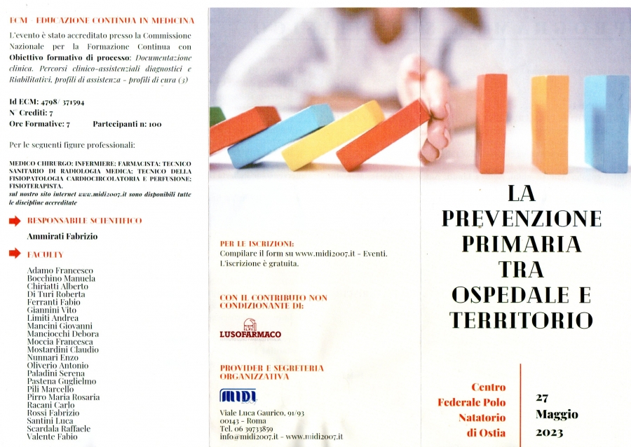 Il 27 maggio 2023 avrà luogo presso il Polo Natatorio di Lido di Ostia Il convegno scientifico organizzato dal Prof. Fabrizio Ammirati, Responsabile della Cardiologia dell’Ospedale G.B. Grassi, dal titolo: LA PREVENZIONE PRIMARIA TRA OSPEDALE E TERRITORIO
